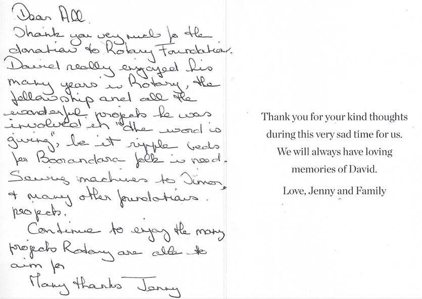 Thank you very much for the donation to Rotary Foundation. David really enjoyed his many years in Rotary, the fellowship and all the wonderful projects he was involved in. "The word is giving", be it ripple beds for Boroondara folk in need, sewing machines to Timor and many other Foundation's projects.