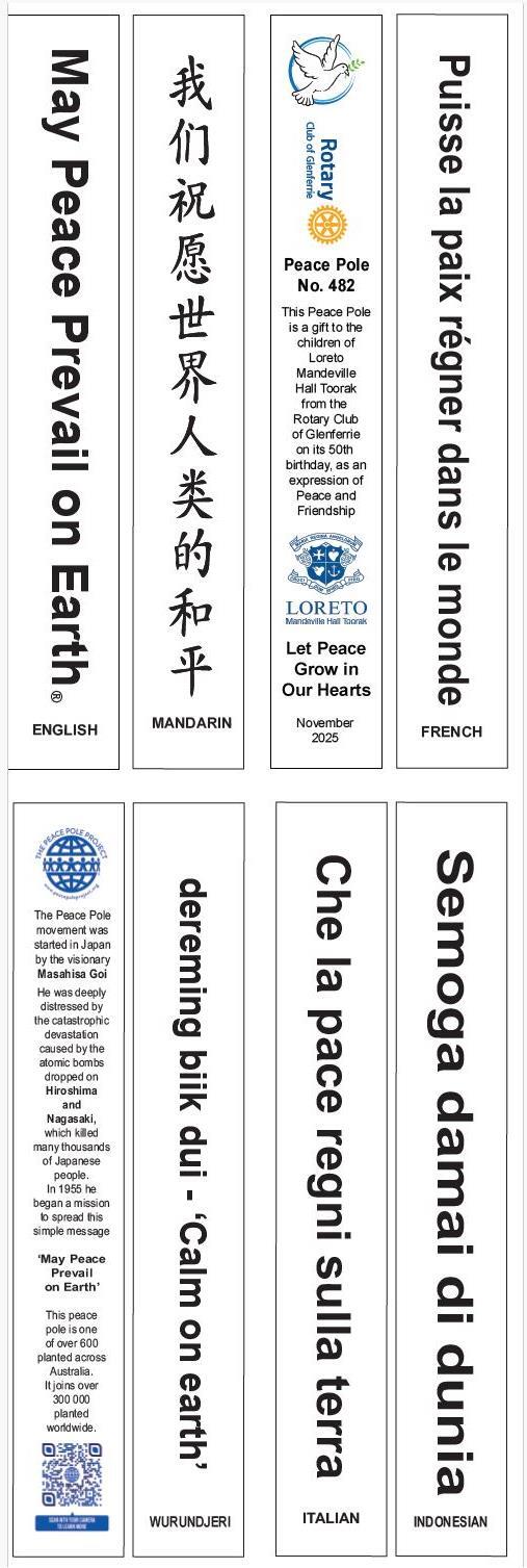 As an official Peacebuilder Club, the Rotary Club of Glenferrie proudly supports initiatives that inspire peace within our schools and communities. The dedication of this Peace Pole at Loreto Mandeville Hall stands as a symbol of that shared commitment to a more understanding and compassionate world.